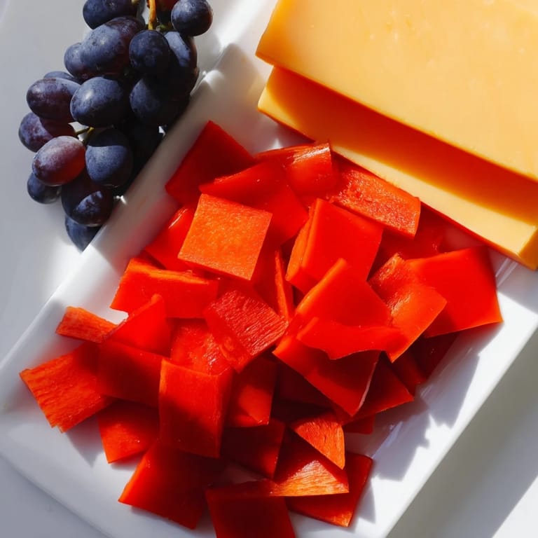 Red bell pepper strips, yellow cheddar or Gouda cheese blocks, and blue or black seedless grapes provide the vivid colors.