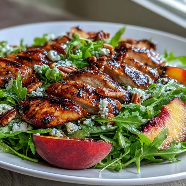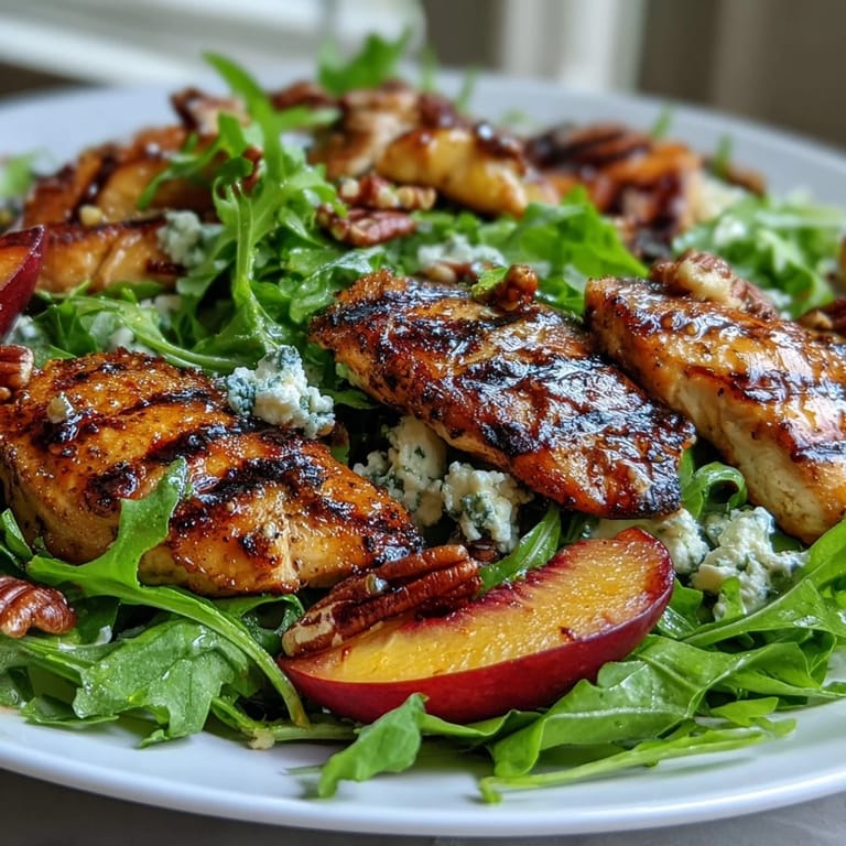 What makes this salad sing is that you've got so many different temperatures and textures happening at once: warm grilled chicken and peaches, cool crisp arugula, creamy feta, nutty pecans, sharp raw onion. Your mouth stays interested the whole time, which is a better compliment than almost any word someone could say about food. I've learned that the best salads aren't the ones with the most ingredients; they're the ones where everything plays a different role.