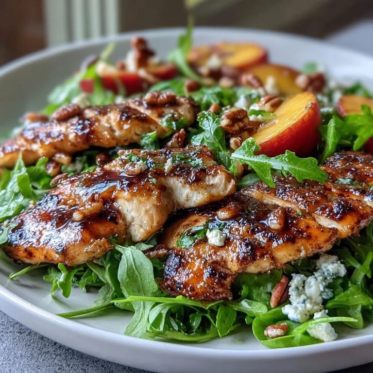 Save There's something about summer that makes me crave salads that actually feel like a meal, and this one came together one humid afternoon when my neighbor dropped off a basket of peaches from her tree. I'd just pulled chicken off the grill for something else entirely, and watching those golden peaches catch the heat sparked the idea to throw everything together. The contrast of that charred sweetness against peppery arugula and tangy balsamic felt like discovering a flavor combination I'd somehow always known.