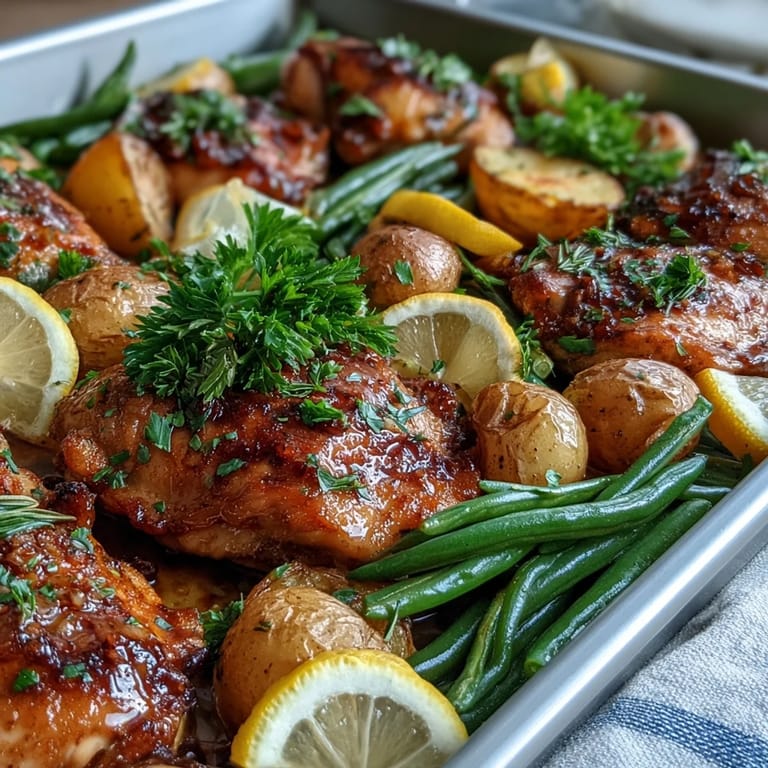 Rosemary instead of thyme brings a sharper, more woodsy note that some nights feel exactly right. I've also used bone-in, skin-on chicken thighs when I want something more forgiving—they stay juicier and need about 5 extra minutes in the oven. Red pepper flakes scattered in the marinade give it a whisper of heat that builds without overwhelming, and I've seen friends swap green beans for broccoli or asparagus depending on the season.
